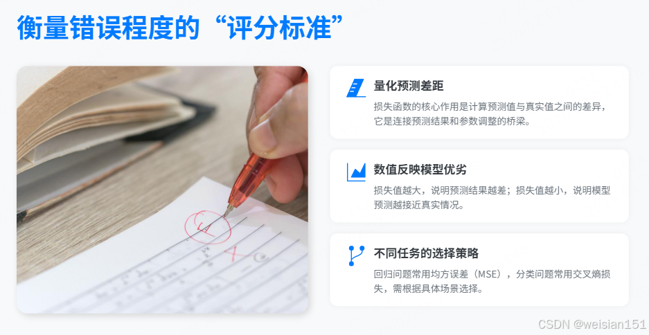 - 做数学题、预测房价 (回归问题)→ 用均方误差(MSE),惩罚大错更狠
