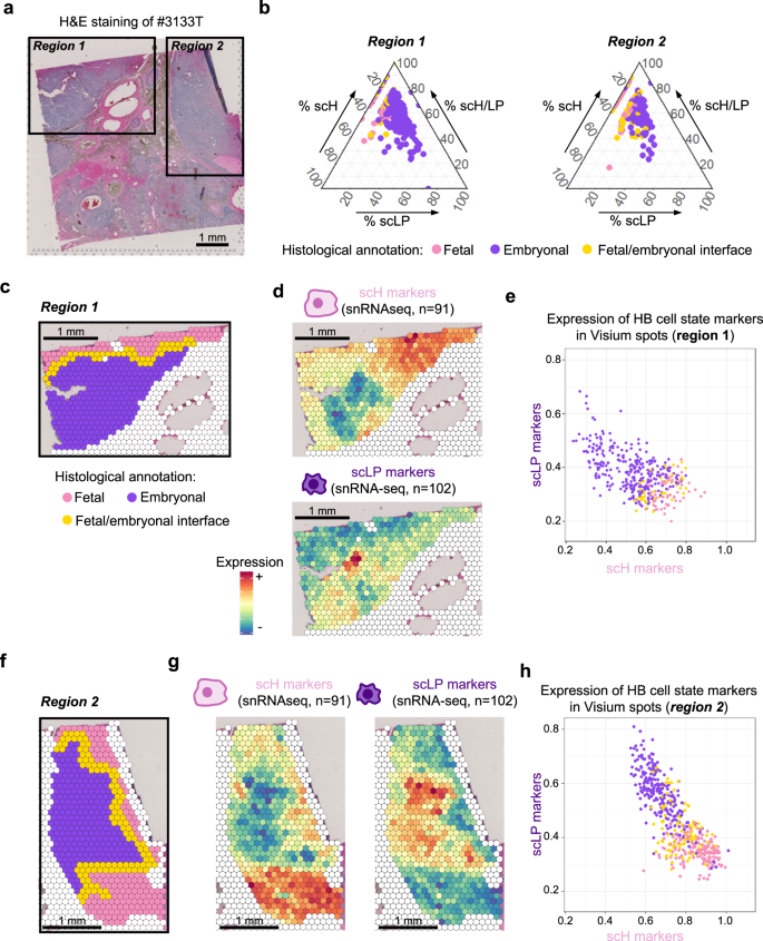 图3:空间转录组测序证实scH/LP中间态细胞定位于胎儿样区域和胚胎样区域的物理交界处。