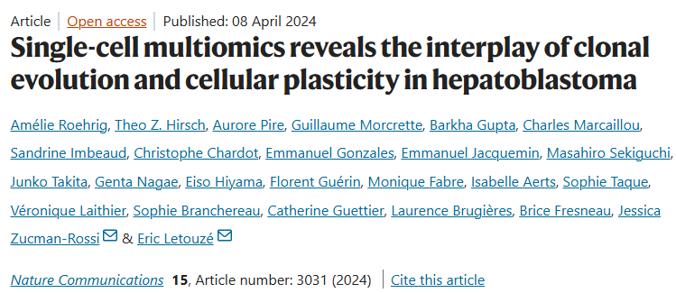2024年4月8日,《Nature Communications》发表了Jessica Zucman-Rossi和Eric Letouzé团队的研究,该研究通过单细胞多组学技术揭示了肝母细胞瘤中遗传克隆演化与表观遗传可塑性如何共同塑造肿瘤的耐药性,,。今天我们就来拆解一下这篇文章:Single-cell multiomics reveals the interplay of clonal evolution and cellular plasticity in hepatoblastoma。