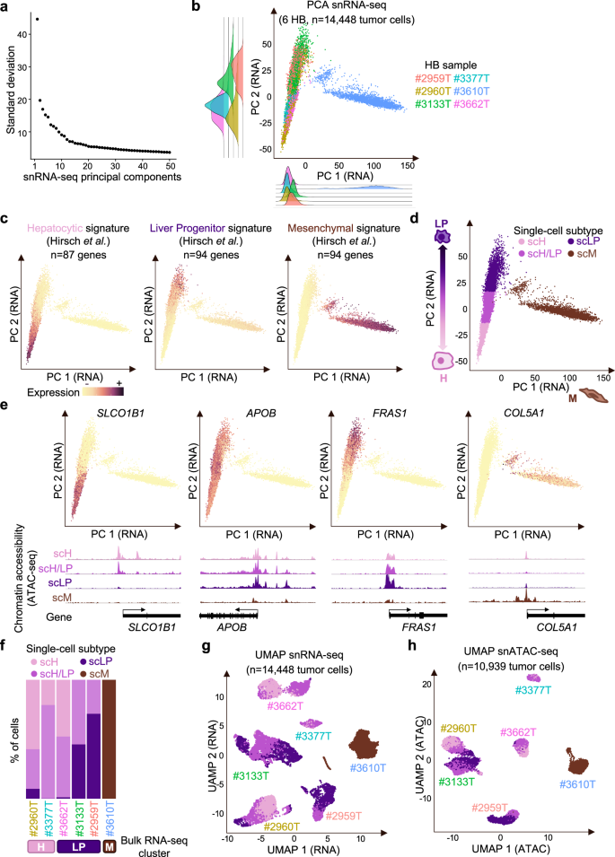 肝母细胞瘤(HB)是儿童期常见的肝脏肿瘤,尽管其基因组背景相对单一,主要涉及CTNNB1突变,但肿瘤内部存在显著的表型异质性,。本研究利用单细胞多组学技术(同时检测转录组和染色质可及性),分析了6例代表性HB样本,发现了肿瘤细胞在肝细胞样(scH)、肝祖细胞样(scLP)和间充质样(scM)三种状态之间存在连续的分化梯度,。研究进一步揭示了遗传亚克隆的演化如何限制或引导这种表型可塑性,最终导致特定亚克隆在化疗压力下富集,。