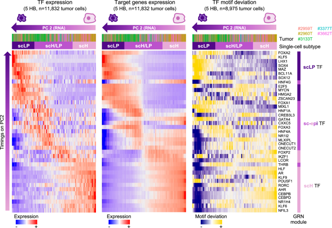 图2:主成分分析显示肿瘤细胞并非处于孤立状态,而是在scH、scLP和scM三个分化极点之间呈现出连续的分布特征。