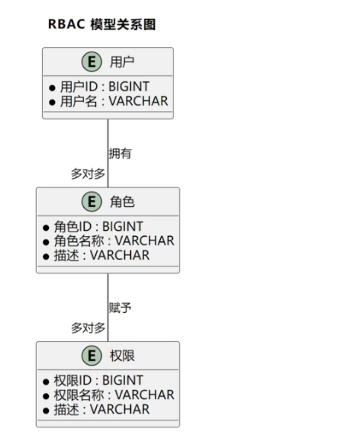 RBAC 权限控制模型(基于角色的访问控制,Role-Based Access Control),核心概念包括 用户、角色、权限。某接口需要A权限,因此先根据用户判断角色,才从角色中抽取拥有的权限进行判断。