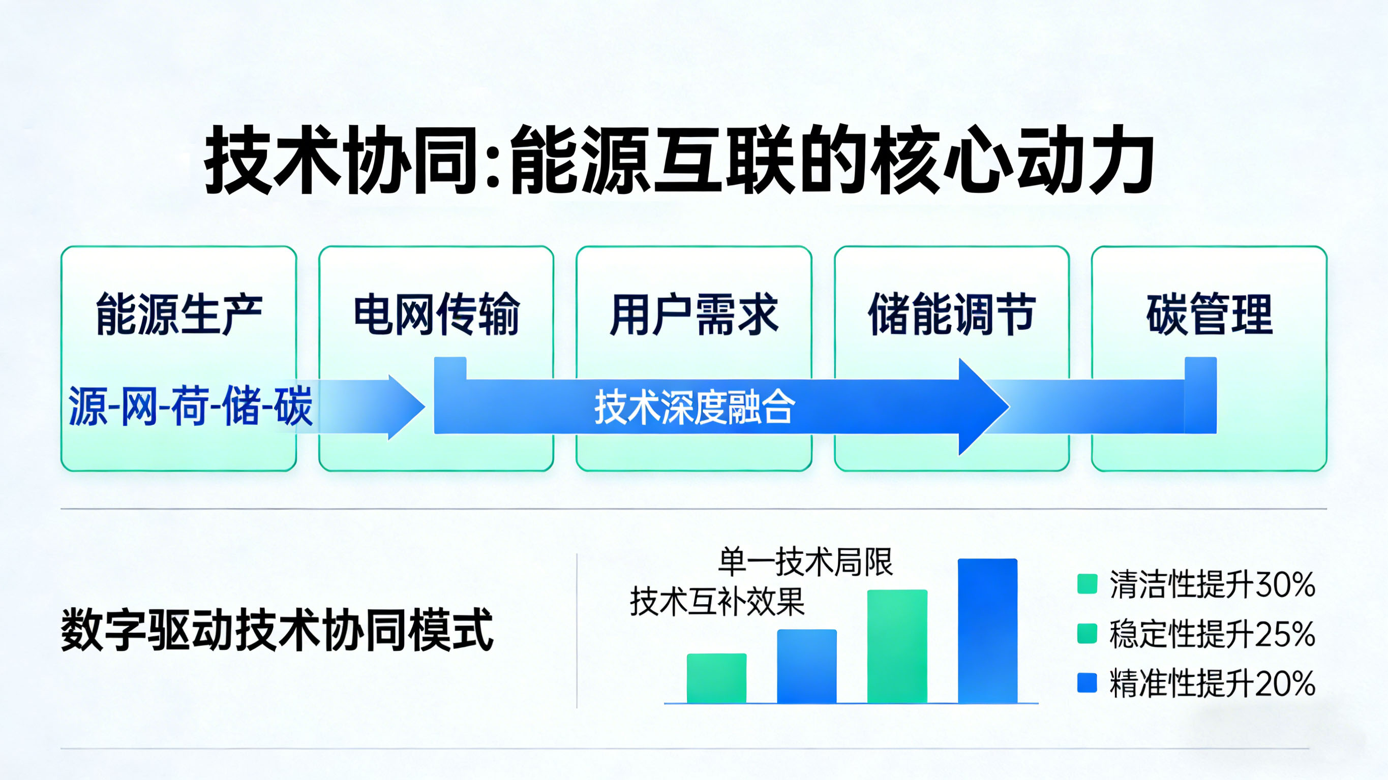 技术协同是能源互联的核心动力,核心逻辑是推动"源-网-荷-储-碳"各环节技术深度融合,通过技术互补破解单一技术局限,提升能源互联的清洁性、稳定性与精准性。