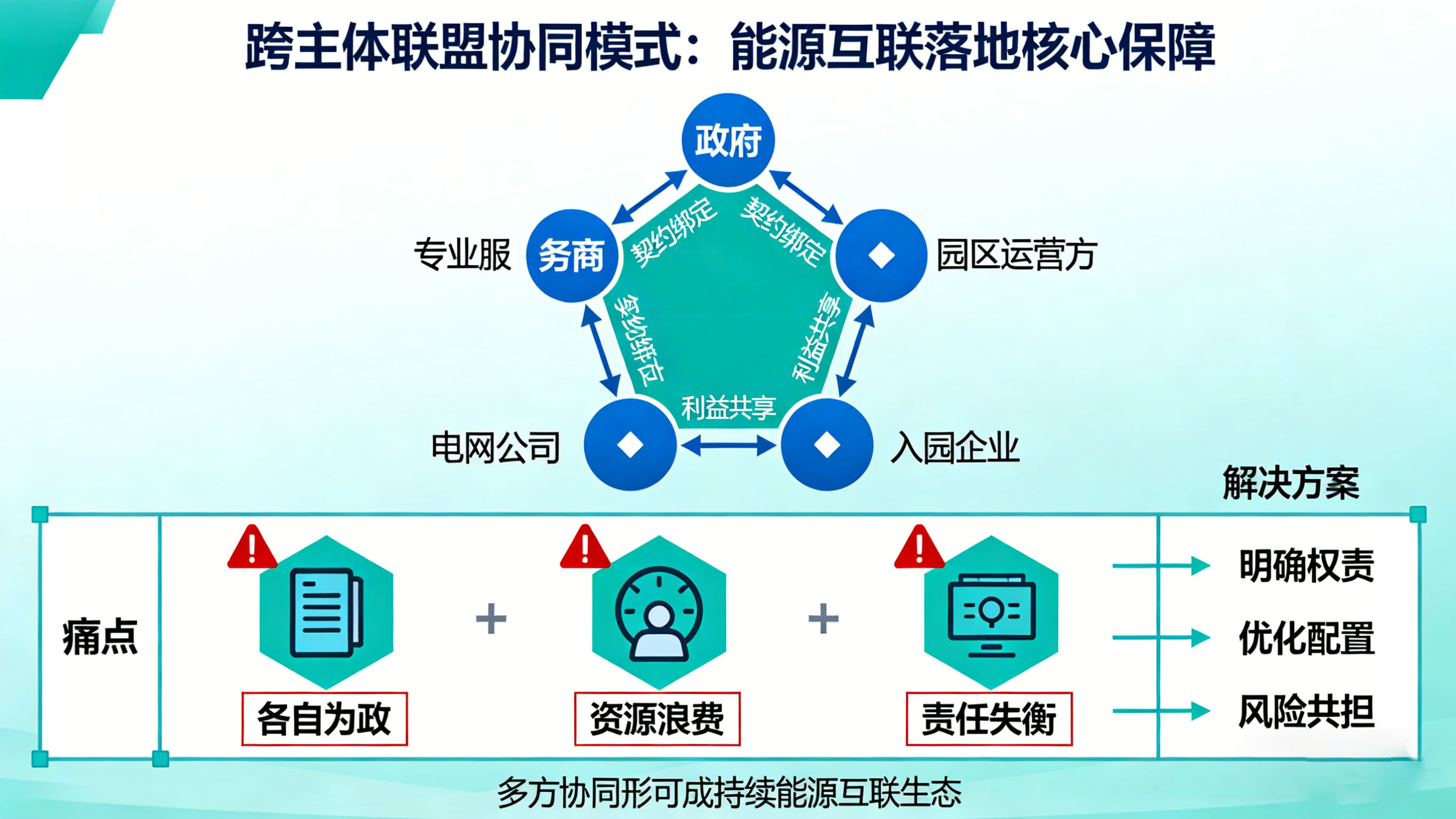 主体协同是能源互联落地的核心保障,核心逻辑是明确政府、园区运营方、入园企业、电网公司、专业服务商等多方权责,通过契约绑定、利益共享形成协同生态,破解"各自为政、资源浪费、责任失衡"的痛点。