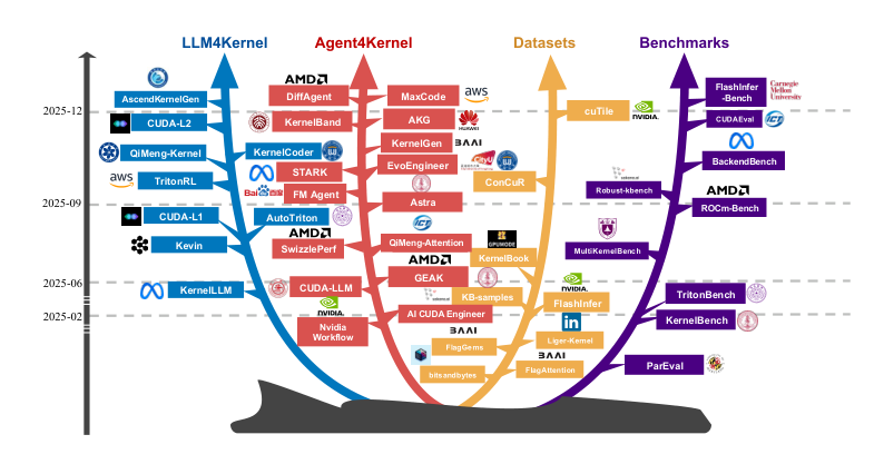 图解:该图按年份和研究方向整理 LLM 驱动 Kernel 生成的发展轨迹,可以直观看到从 SFT、RL 到 Agentic 系统的研究爆发趋势,以及数据与评测体系逐步完善的过程。