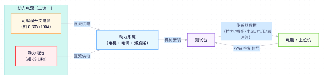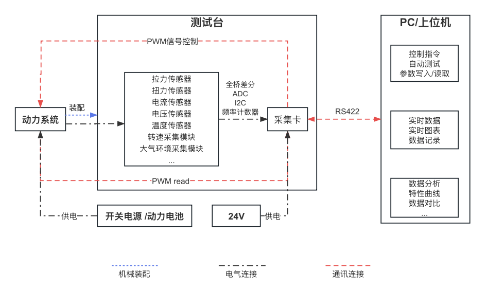 如下图所示,图中清晰展示了测试台、动力系统、电源、上位机之间逻辑控制关系以及测试台的运行机制。