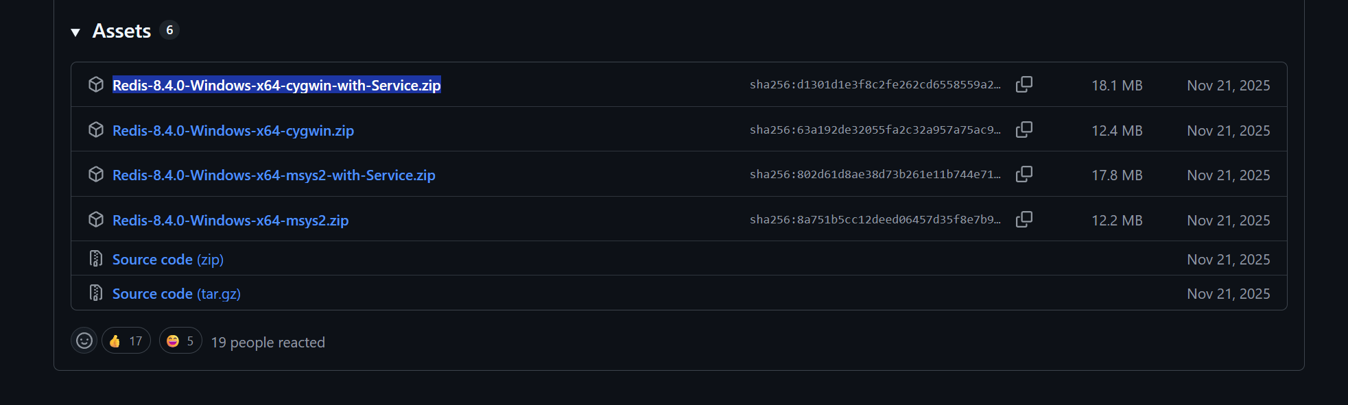翻到最下面安装Redis-8.4.0-Windows-x64-cygwin-with-Service.zip,这是一个使用了 Cygwin 环境 来运行 Redis的编译版本,Cygwin 是一个在 Windows 上提供 POSIX 兼容层 的工具(类似轻量级 Linux 子系统)。用 Cygwin 把 Redis "套"在 Windows 上跑。