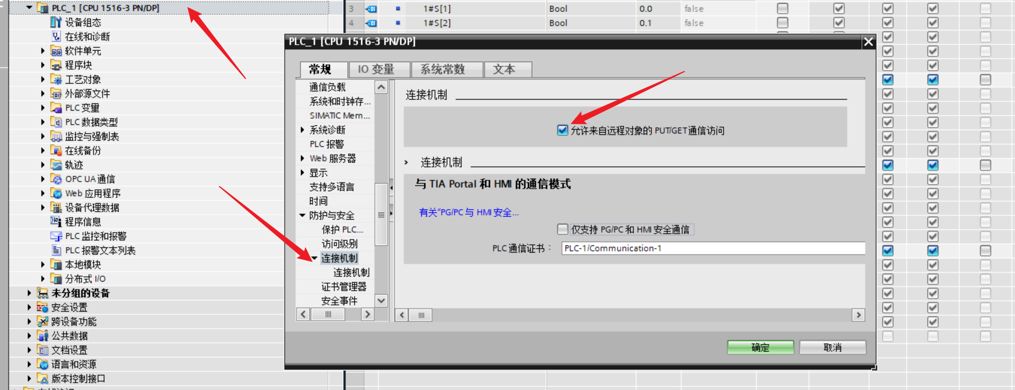 选中PLC右键属性勾选连接机制的允许来自远程对象的PUT/GET通讯访问