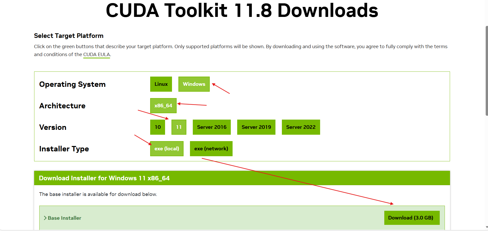 我这里选择11.8版本,选择操作系统、版本等