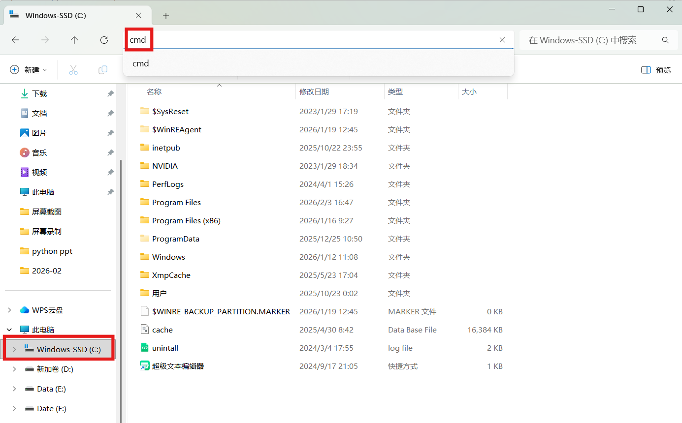 或者在C盘输入路径中输入cmd进入命令提示符