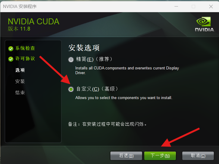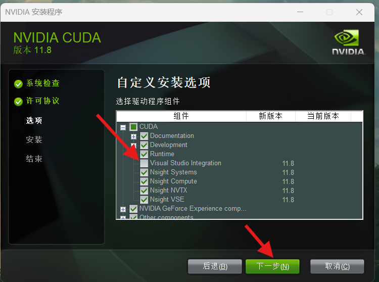出现此界面将CUDA展开将Visual Studio Integration取消选中,选中Visual Studio Integration可能会导致出现问题,点击下一步