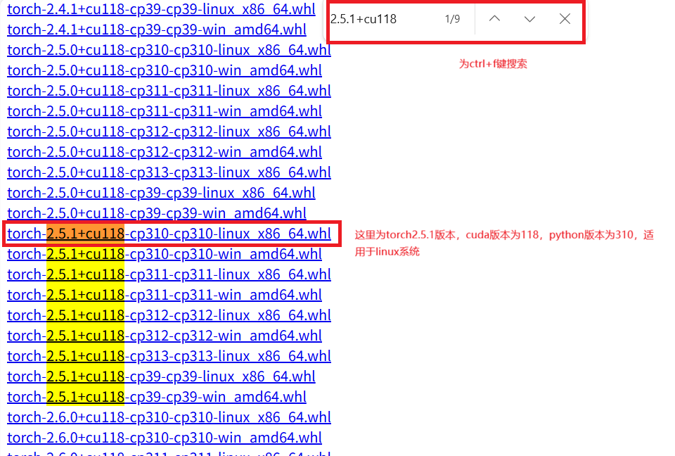 使用快捷键ctrl+f键输入想要下载的版本,要对应自己下载的CUDA版本与python版本,和自己的电脑系统