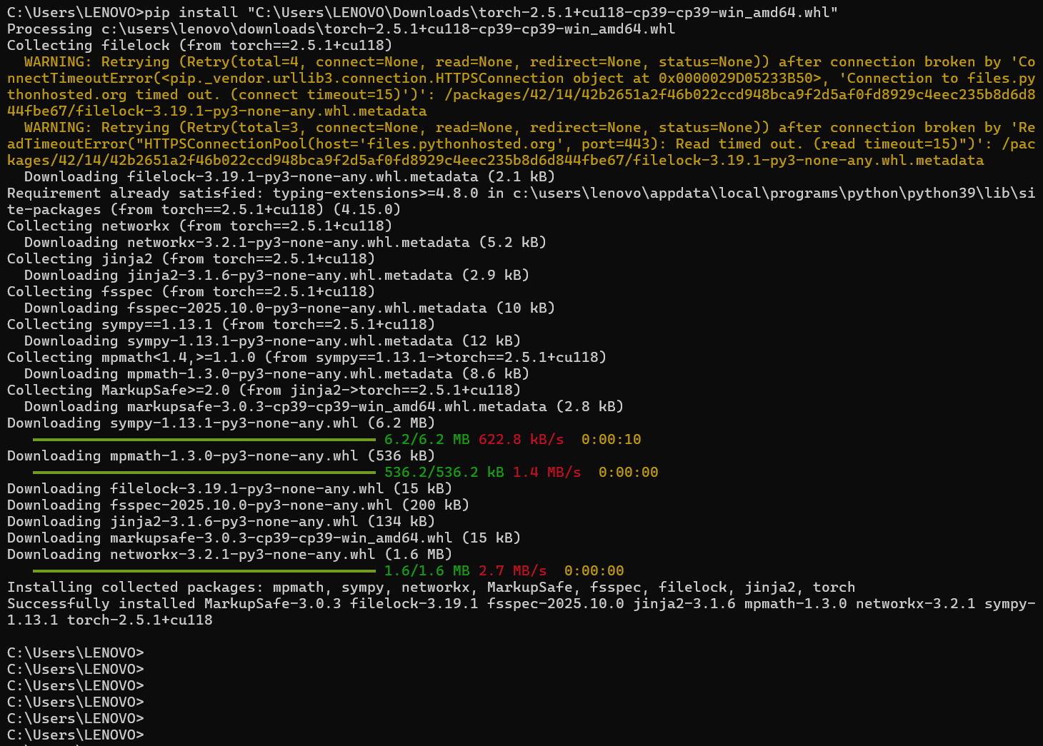 如果在下载TorchVision、Torchaudio中torch出现问题,将安装torch语句在输一遍就行了