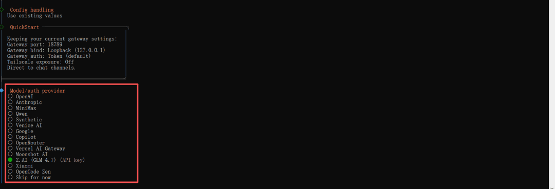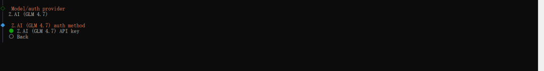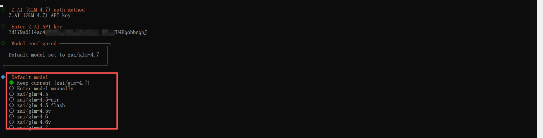 - 接下来,需要配置AI大模型的API Key,大家可以根据自己已有的大模型AI进行选择,选择后,会有详细的说明填写API Key,本示例,用的是Z.AI。