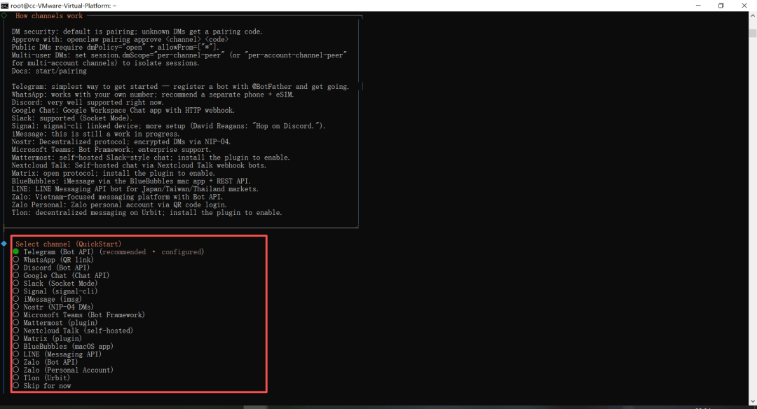 - 再接下来,就需要配置国外聊天工具的机器人了,如果您有对应的,进行选择即可。选择后,需要配置一些参数,里面都会有详细的指导说明。如果还没有,可以选择跳过先。后续也可以回到工作台继续配置。