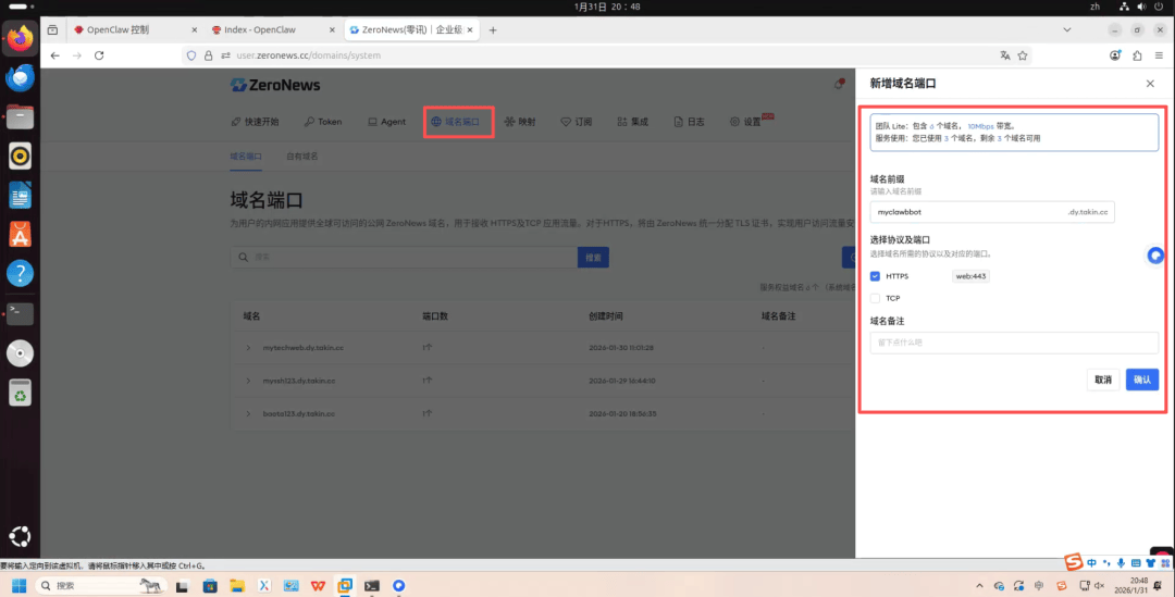 - 接着,我们在域名端口页面,创建一个可用的公网域名(自定义前缀),并勾选HTTPS 协议端口。