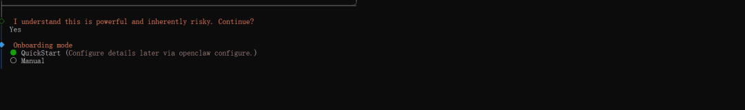 - 这里,它会问你选择 Onboarding mode,根据自己选择,这里我们可以选择 QuickStart。