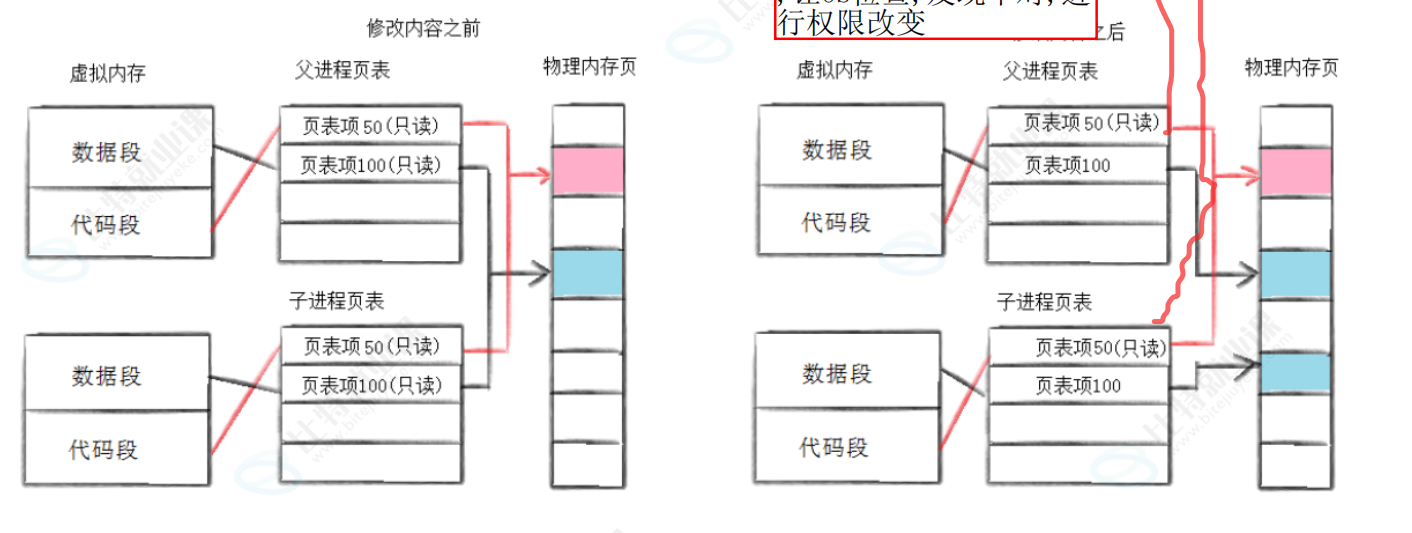 可以看到修改前,数据段都为r,修改后,不只为r,原理是对权限为r的数据段进行写入,OS会检查,发现错误,就会自动修改权限,进行拷贝