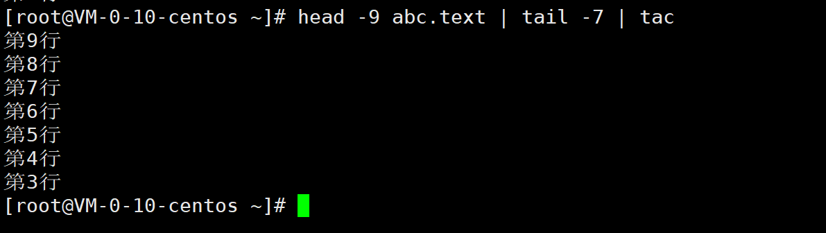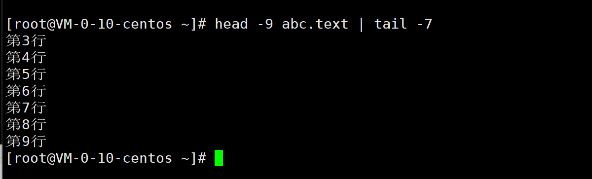 这里是先从abc.text文件里面取出前9行,然后使用管道再取出当前数据的后7行,即可显示原文本的第3行到第9行