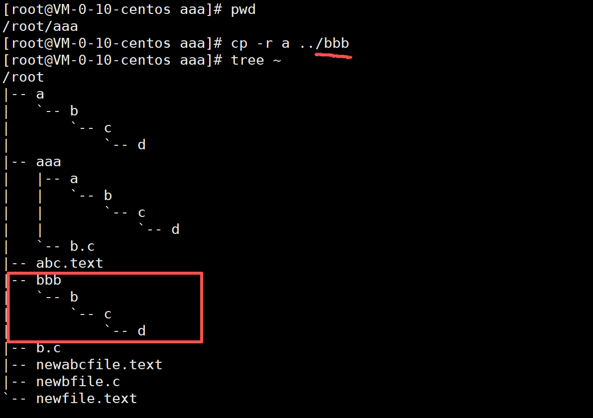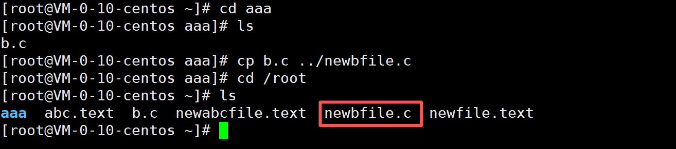 当前在目录aaa中,现在把b.c拷贝到root目录中