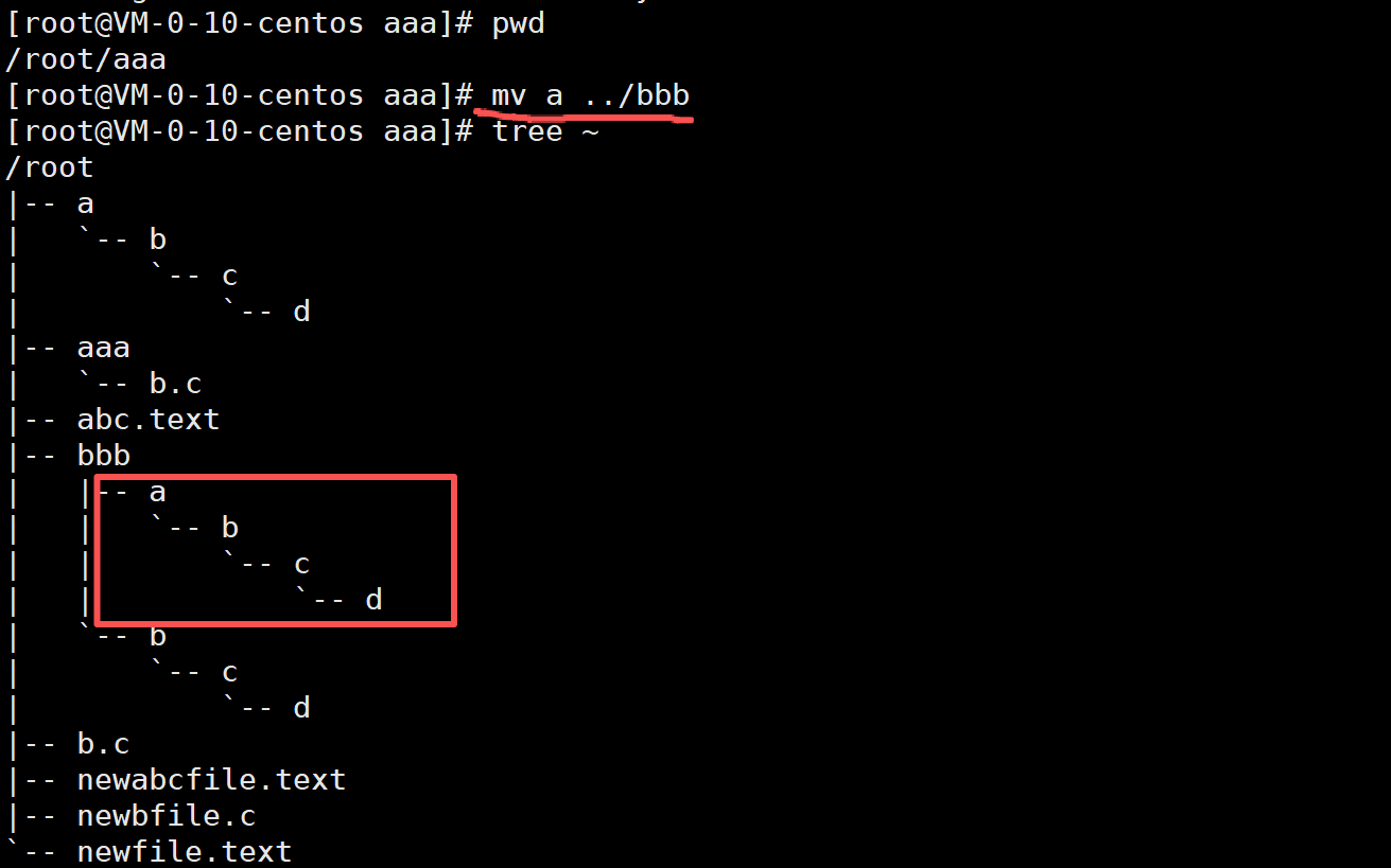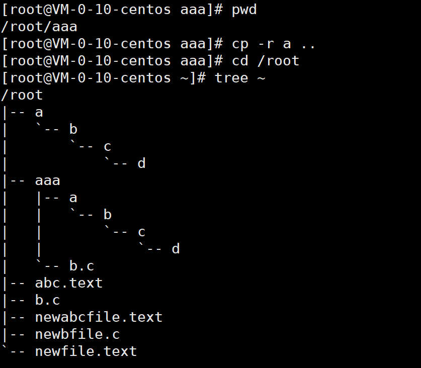 这是当前的文件结构。现在把目录a拷贝到root目录下。在拷贝的时候要加上 -r