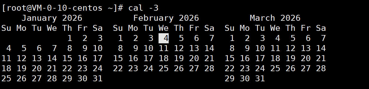 cal -3显示当前年份的当前月份和当前月份的前一月份和当前月份的下一月份
