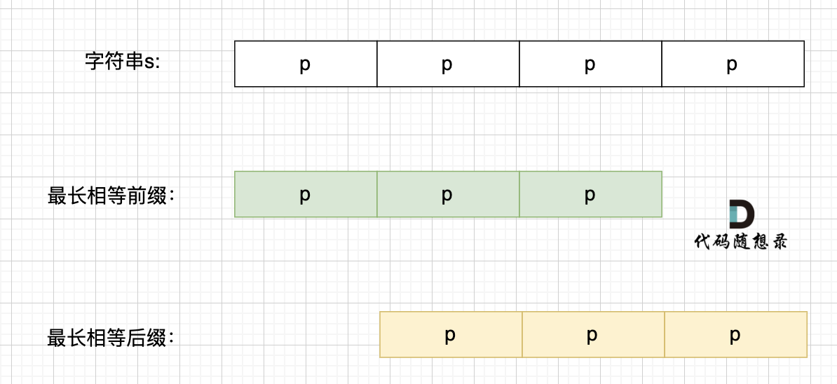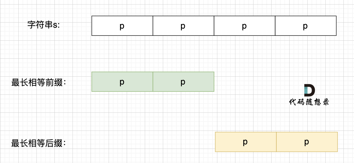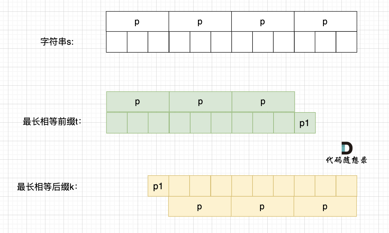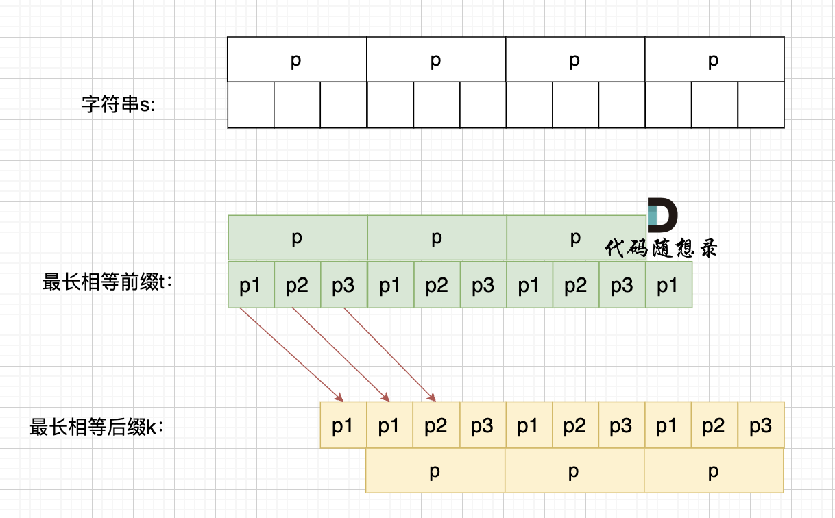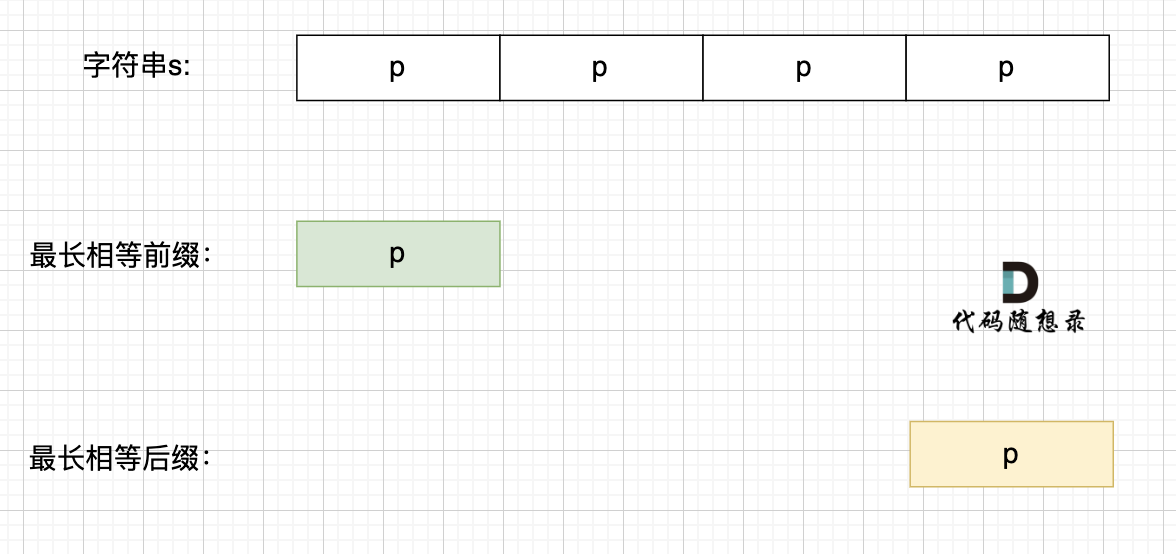 那么既然前面有相同的子串,后面有相同的子串,用 s + s,这样组成的字符串中,后面的子串做前串,前面的子串做后串,就一定还能组成一个s,如图: