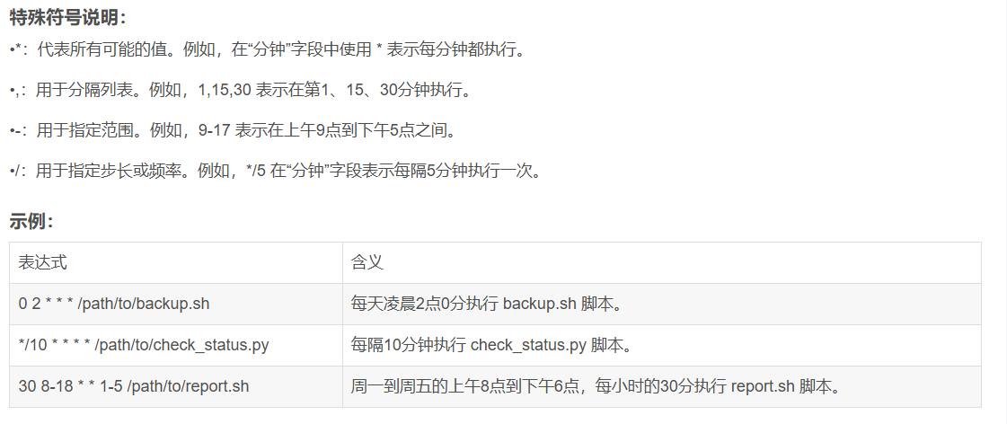 - cron 是一个守护进程,它会周期性地检查 crontab文件,并根据文件中的指令在预定的时间执行任务。