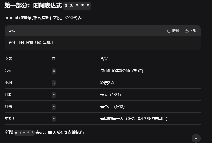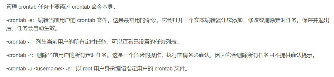 - crontab 就是 Linux 系统中用于设置和管理这些定时任务的强大工具。它允许用户在指定的时间点或时间间隔自动执行命令或脚本。