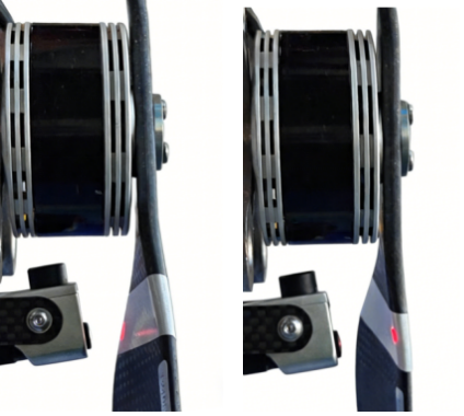 - 盘动桨叶,调整聚焦镜前后位置,使光斑在桨叶的全轨迹范围内无散射;如图所示,桨叶存在一定的扭转角度,因此聚焦镜投射光斑在扫过整片桨叶时投射距离并不相同,应保证在投射距离最远(图位置)时,该距离依然在规定使用范围内,即LY-MICRO-30KGF无人机动力测试平台15-40mm,LY-70KGF-MAX无人机动力测试平台70mm以内;