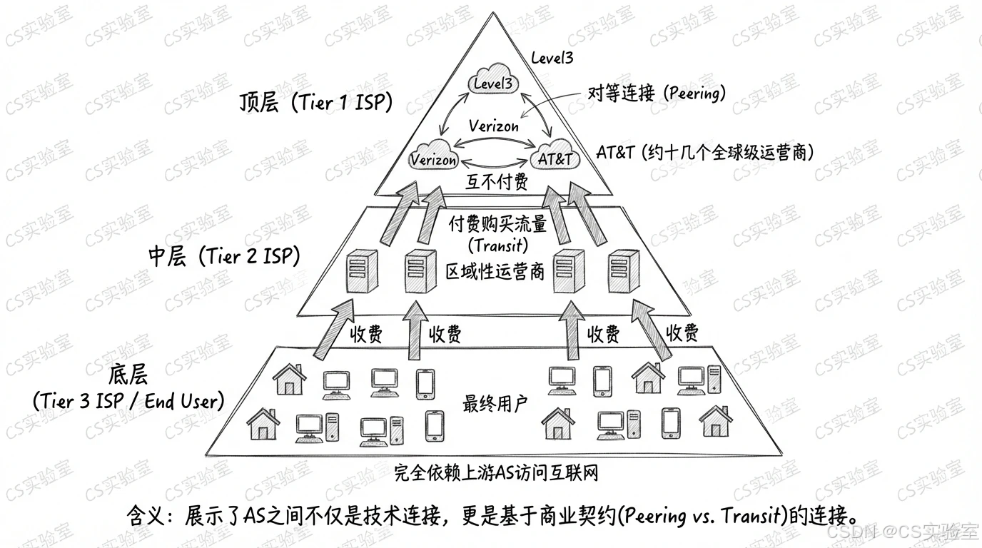 并非所有的 AS 都是平等的。根据业务性质和连接方式,AS 主要分为以下三类,这构成了互联网商业模型的基础。