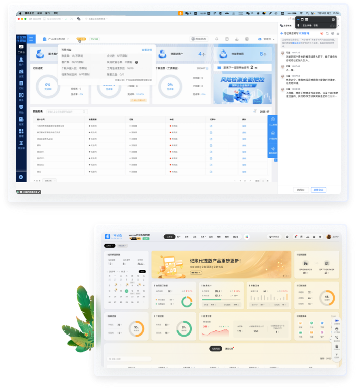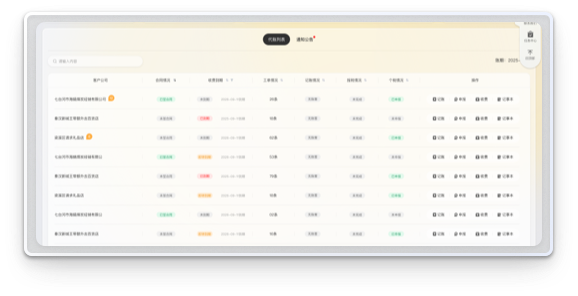 首页被定义为"代账驾驶舱"------不是简单罗列数据,而是按"今日必须处理→本周重点关注→长期风险预警"三级节奏组织信息。通过卡片化分区、进度可视化、色彩层级提醒,把"代账公司老板最关心的经营指标"与"会计最急迫的待办事项"并排呈现,实现从工具到生意参谋的跃迁。