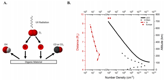 (A)原子氧与有机表面的基本相互作用示意图(B)原子氧密度随以下参数变化的函数:距地球(LEO)的高度和火星表面高度(黑色坐标轴),以及距木星(1 R_J = 69,911 km)的径向距离,针对木卫一和木卫二(红色坐标轴)