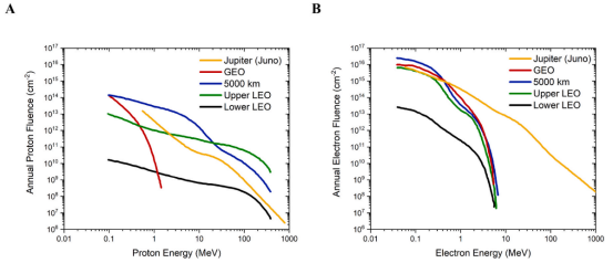 基于空间环境信息系统(SPENVIS)模拟的年注量,作为(A)质子能量和(B)电子能量的函数