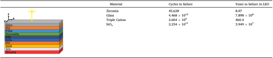 太阳能电池堆栈各组件达到机械失效前的热循环次数。插图为建模的光伏器件各层示意图