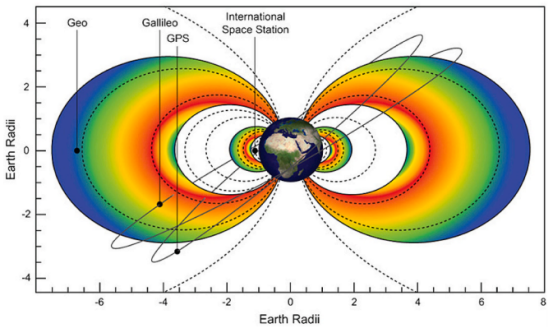不同卫星轨道相对于地球及地球电子辐射带的位置关系