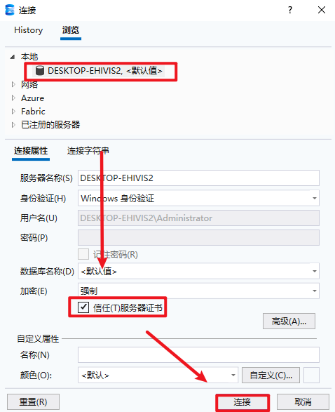 25.点击"浏览",选择本地服务器,勾选"信任服务器证书",点击"连接"