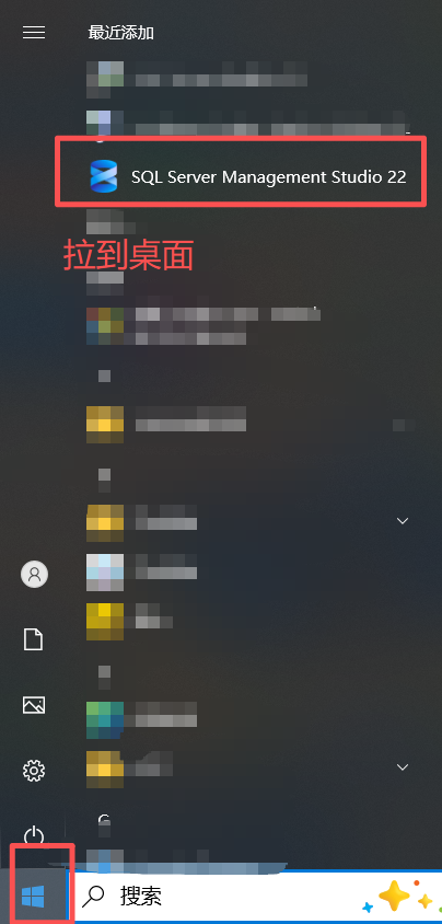 21.点击桌面任务栏中的【开始图标】,将【SQL Server Management Studio 22】图标拖到电脑桌面。