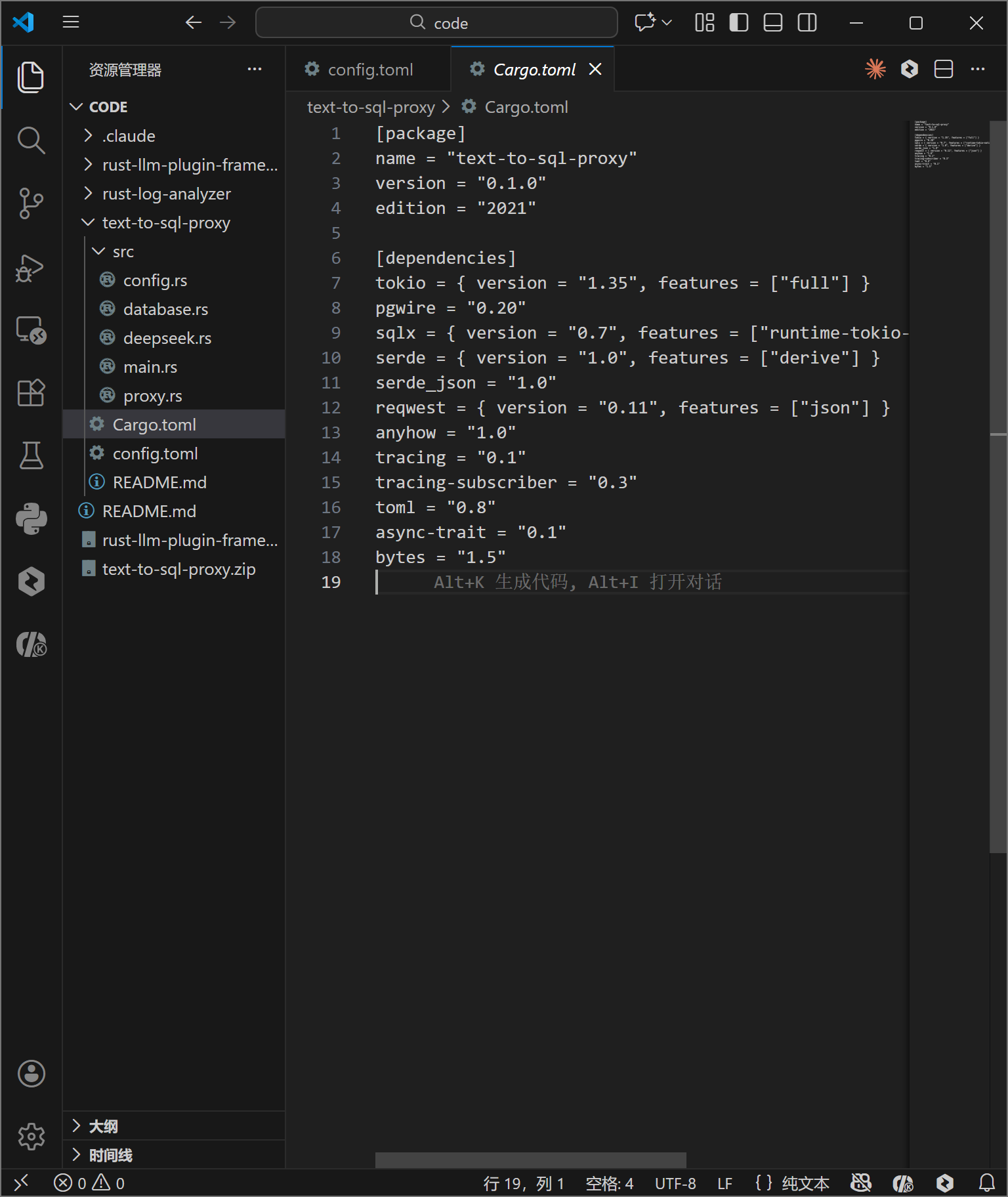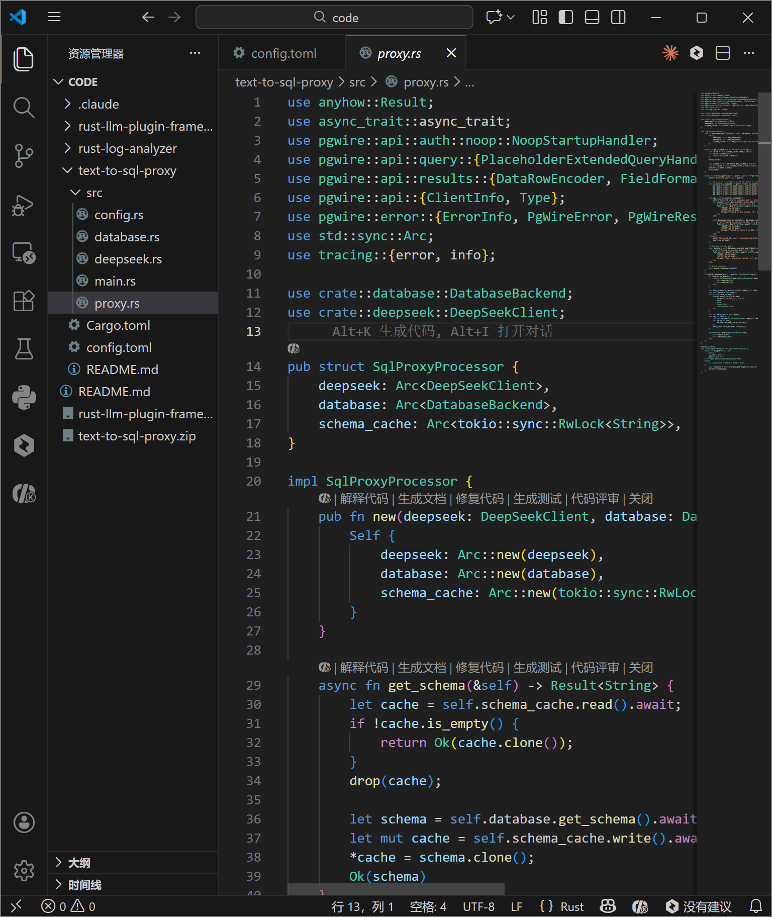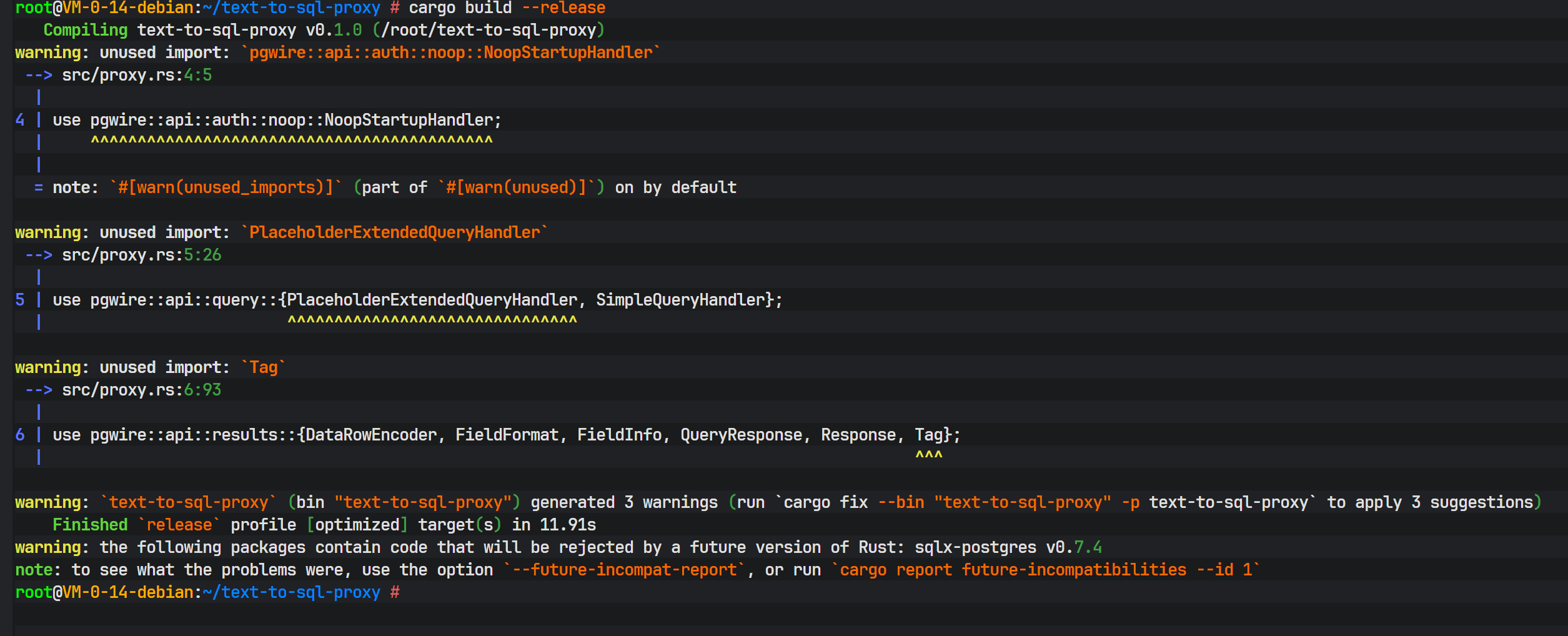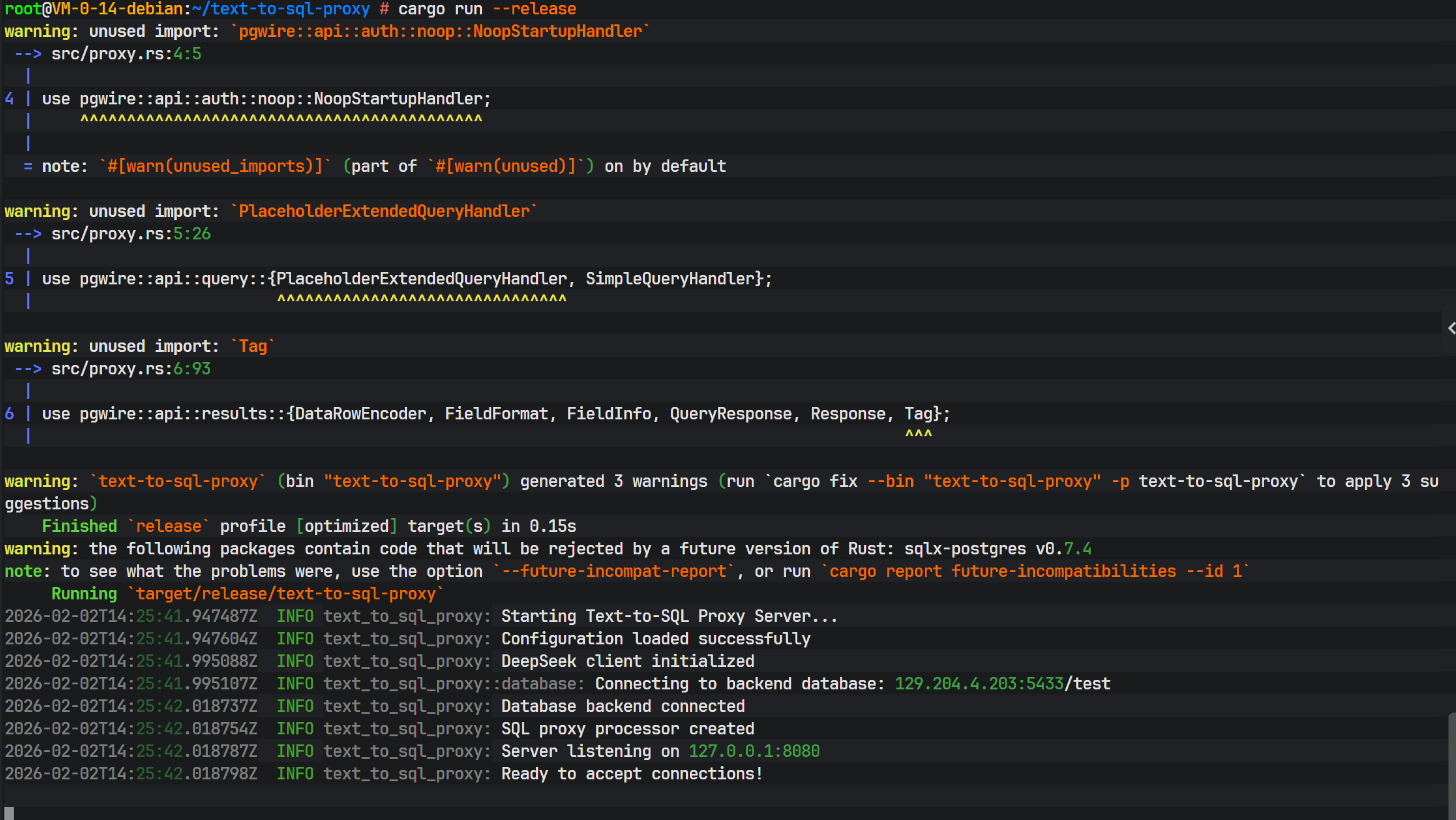 编译过程会下载所有依赖并进行编译,最后生成 target/release/text-to-sql-proxy 二进制文件。Rust 的编译时间通常较长,这是因为其在编译期进行了大量复杂的静态分析和优化。
