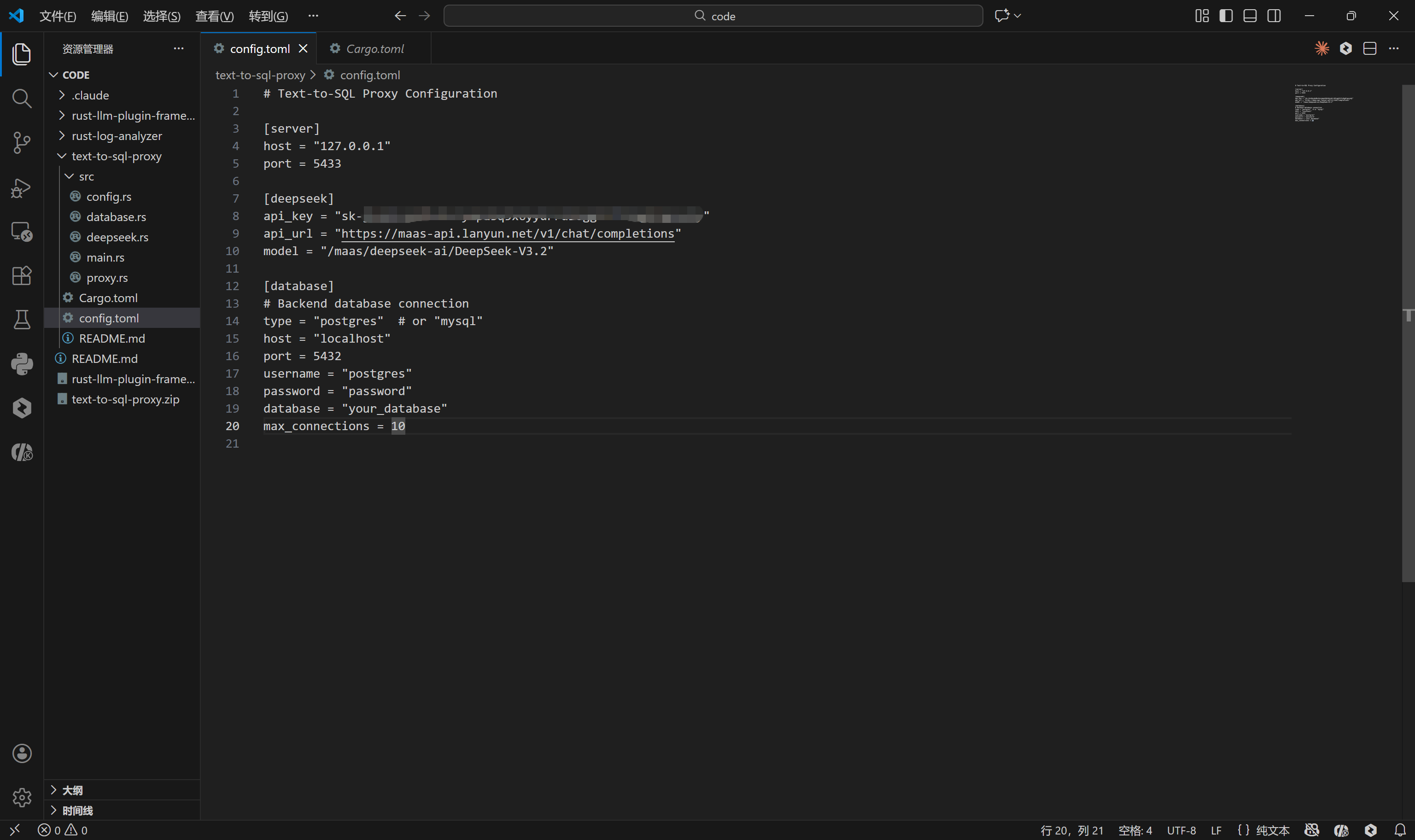 项目使用 config.toml 文件集中管理服务端口、API 密钥及数据库连接信息。TOML 格式因其语义清晰、易于阅读且支持强类型解析,非常适合作为配置文件格式。