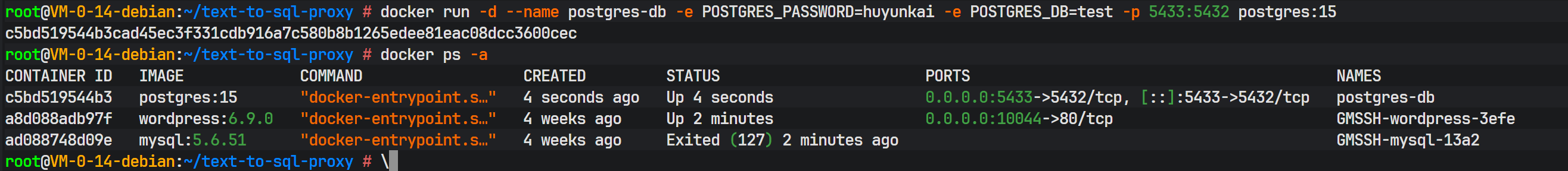docker run -d --name postgres-db -e POSTGRES_PASSWORD=huyunkai -e POSTGRES_DB=test -p 5432:5432 postgres:15
