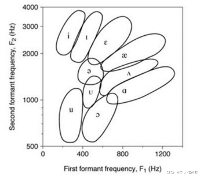 不同音素在 F1-F2 平面上的位置不同。F1 表示第一个共振峰,F2 表示第二个共振峰