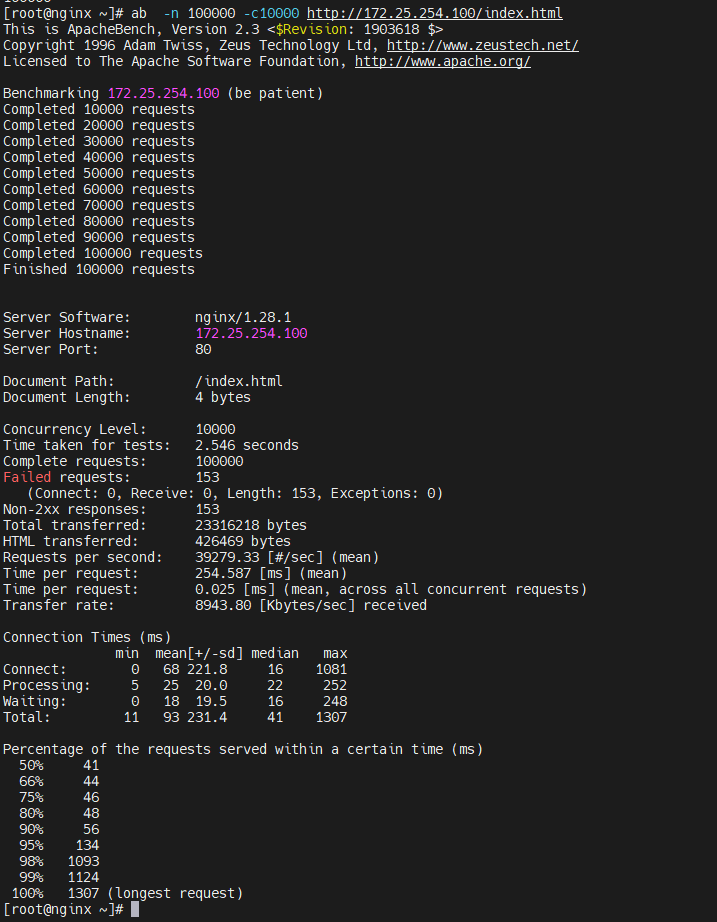 [root@Nginx ~]# ab -n 100000 -c10000 http://172.25.254.100/index.html