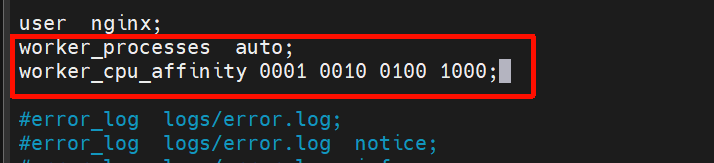 # worker_cpu_affinity 0001 0010 0100 1000; # 可选,按需设置