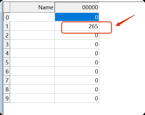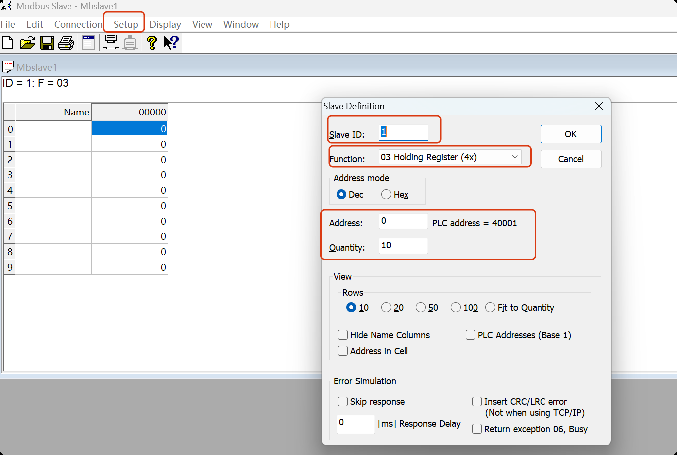 此时,Modbus Slave 会自动创建一个包含 10 个寄存器的表格,初始值如下: