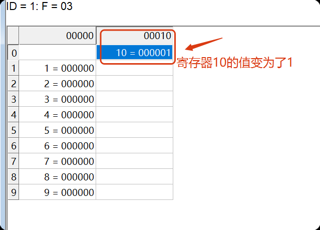 观察 Modbus Slave :寄存器 10 的值应变为 1