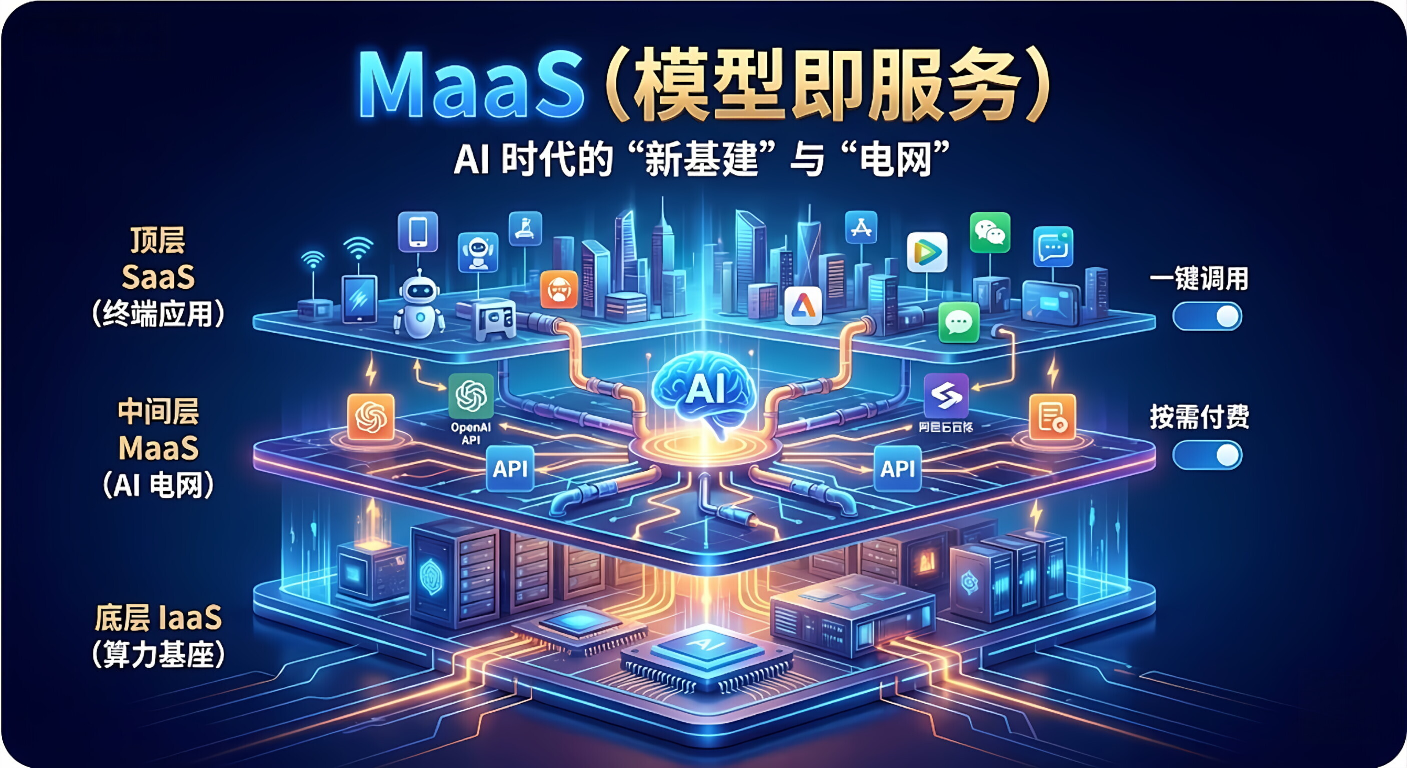 那么 MaaS (模型即服务) 就是**"国家电网"** ------你不需要自己买发电机(显卡),也不需要自己铺设电缆(部署模型),你只需要接上插头(调用 API),就能直接使用原本极其昂贵、复杂的智能能力。