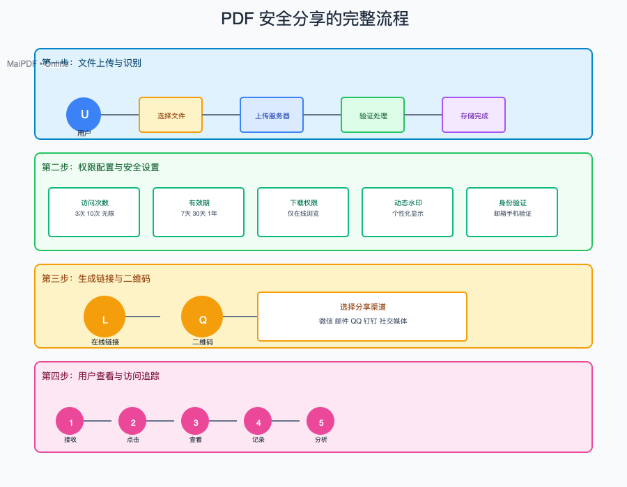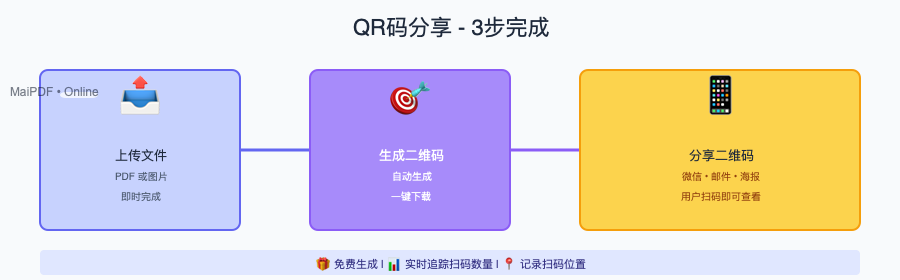 流程从上传 PDF 开始,系统生成分享链接/二维码,供对外分发。