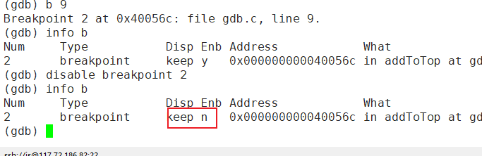 vs的断点不还有实心和空心的状态嘛,当断点时空心的时候就是失去作用了,linux里面也可以输入 disable breakpoint 2后能发现2号断点Enb选项是 n