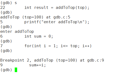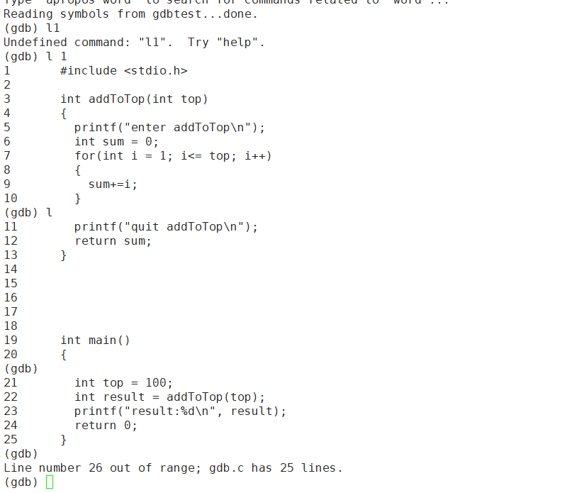 l 1指令就是从第一行开始显示代码,继续输l就能把历史的代码全部展示出来,gdb能自动记录我们最近一次写的输入的指令,所以直接回车也能显示代码